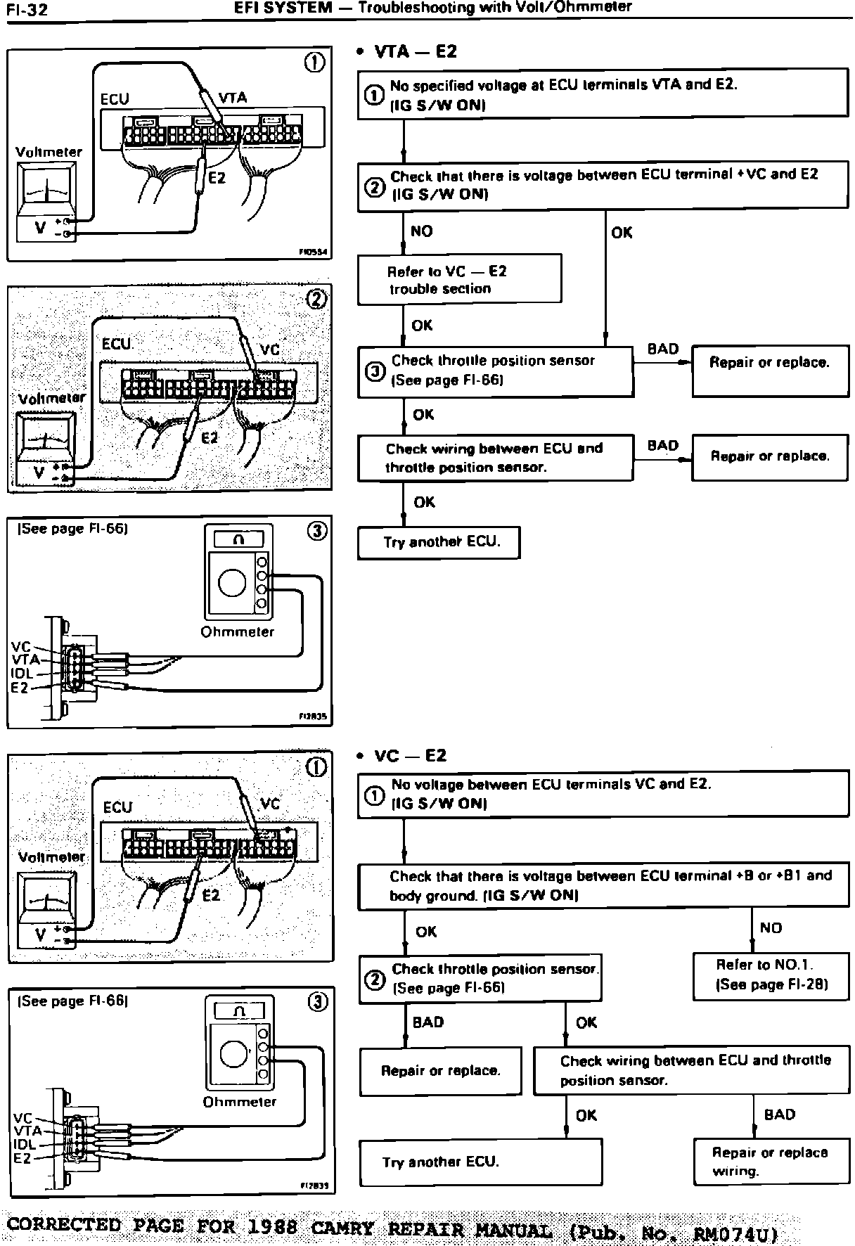These pages are revisions of the EFI SYSTEM - Troubleshooting with Volt/ohmmeter section of the 1987 and 1988 Camry Repair Manuals. Please adhere the provided sticker to your copy of the indicated publications. The information on the sticker will direct you in the future to the revised information in the service bulletin.