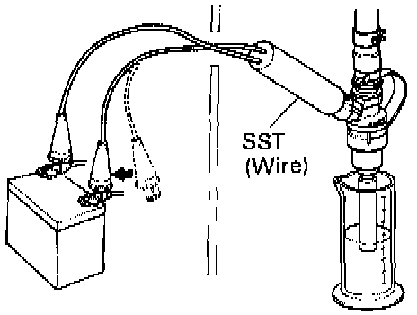 (k) Connect SST (wire) to the injector and battery for 15 seconds, and measure the injection volume with a graduated cylinder. Test each injector two or three times.