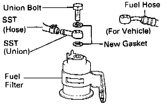 (b) Connect SST (union and hose) to the fuel filter outlet with new gaskets and the union bolt.