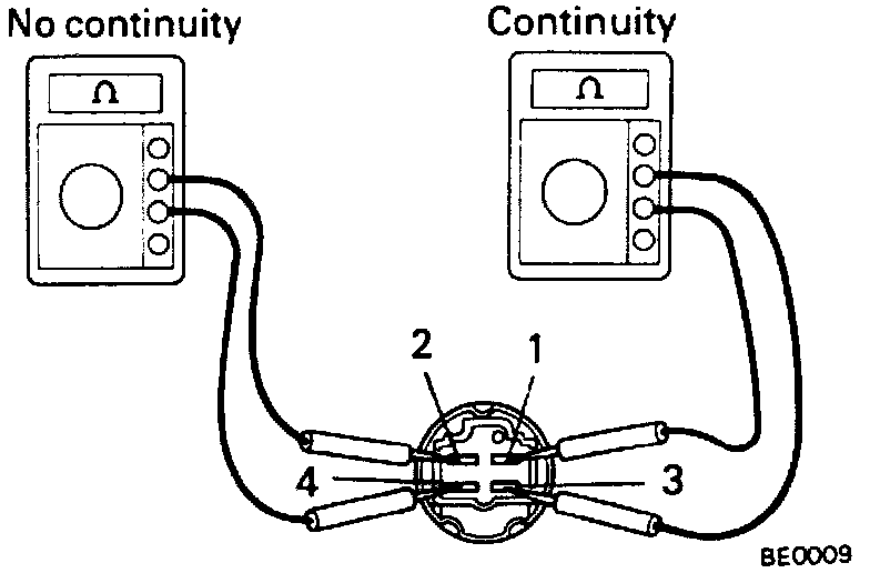 Check for continuity between terminals 1 and 3. No continuity should be between terminals 2 and 4. If not as specified, replace the relay.