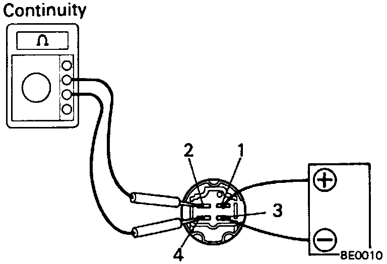 Apply battery voltage as shown in the illustration. Check for continuity between terminals 2 and 4. If operation is not as specified, replace the relay.