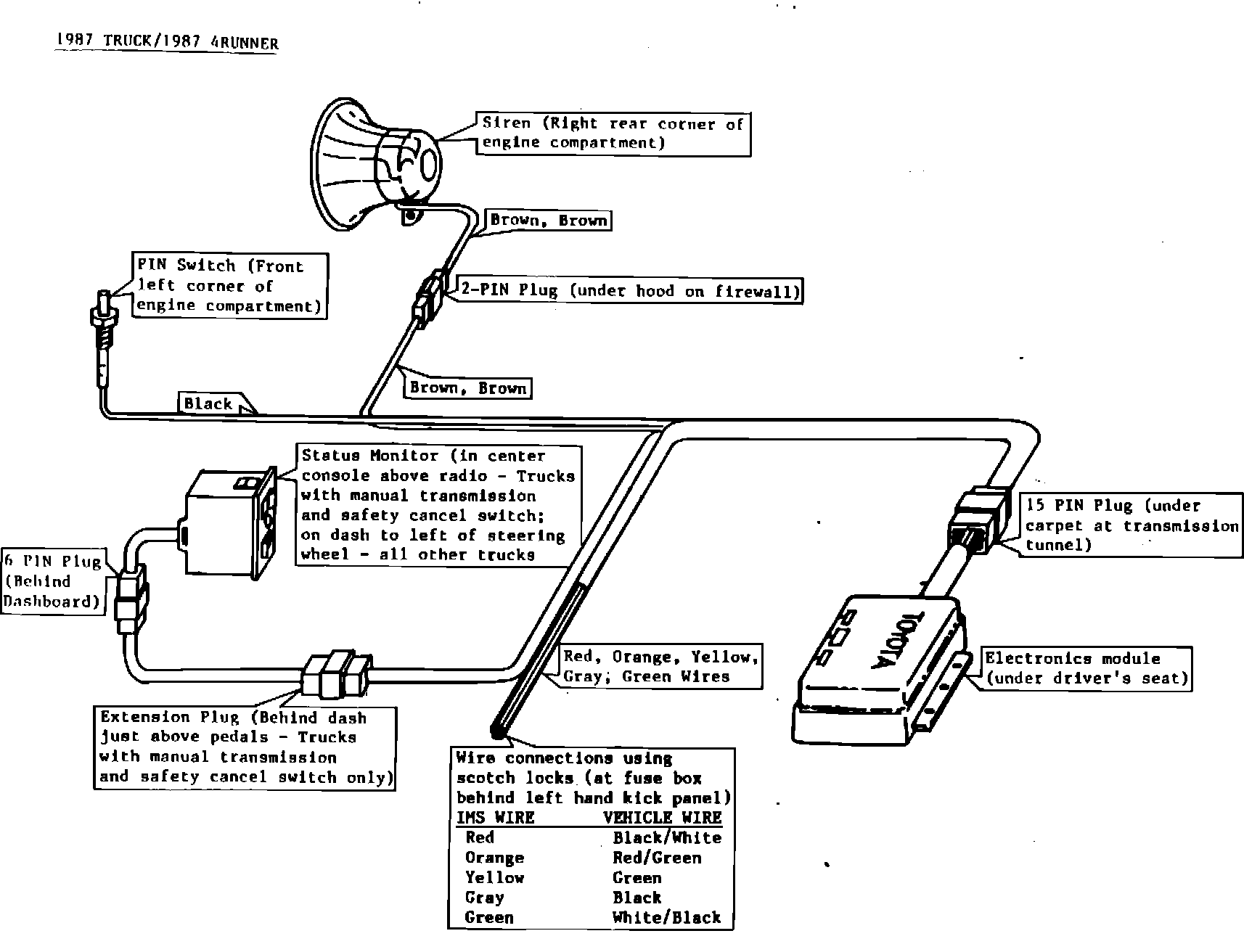 The components are shown in their approximate relative positions and are identified by component name and location in the vehicle. The drawings are not to scale. Where wire connections exist between the IMS System and the vehicle wiring, wire colors on both sides of the kit Scotchlock Connections are indicated. The functions of the various IMS System wires are described completely and in detail in Toyota Service Bulletin, Volume VIII, Number 008, issued December 2, 1985. Please refer to this Bulletin for further details. Briefly, the functions are as follows: