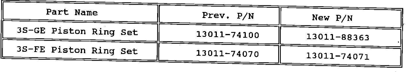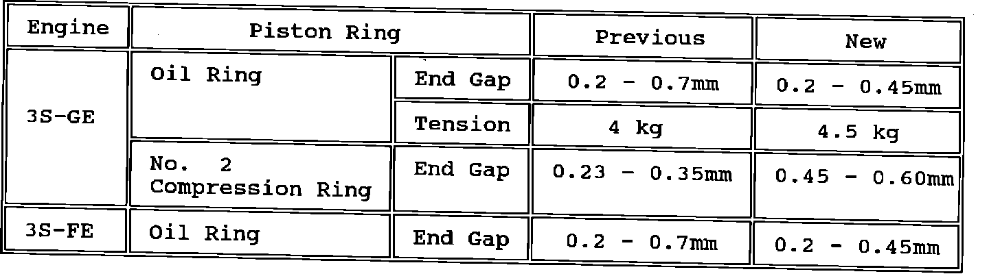 To reduce oil consumption on 3S-GE and 3S-FE engines the piston ring design has been changed. See details below.