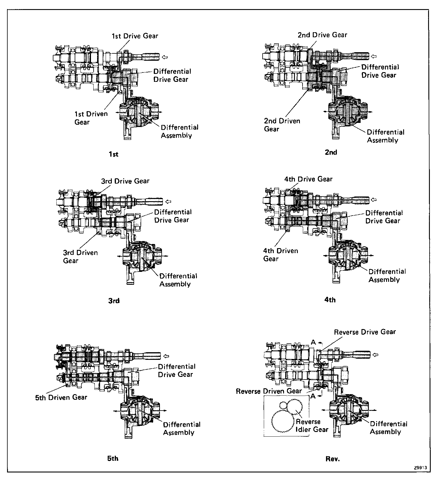 - Transaxle types S51 are constant mesh synchronizers for forward gears, and a sliding mesh reverse gear.- The input shaft is composed of the 1st and 2nd speed gears and the reverse drive gear, and the output shaft is composed of the drive gear (for use with the ring gear).