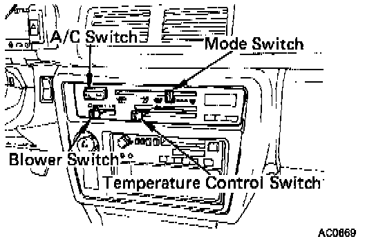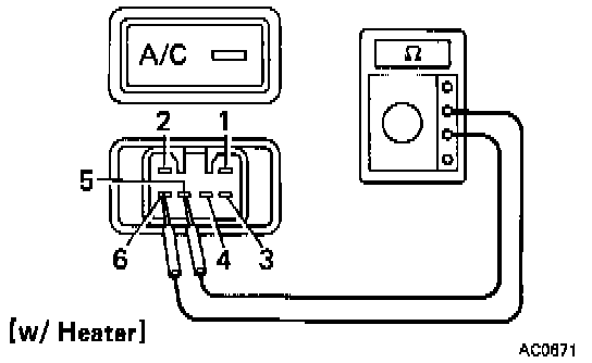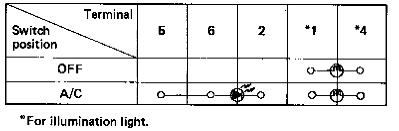 4. (with Heater)Check A/C switch for continuity. Using an ohmmeter, check continuity between the terminals for each switch position as shown in the table.