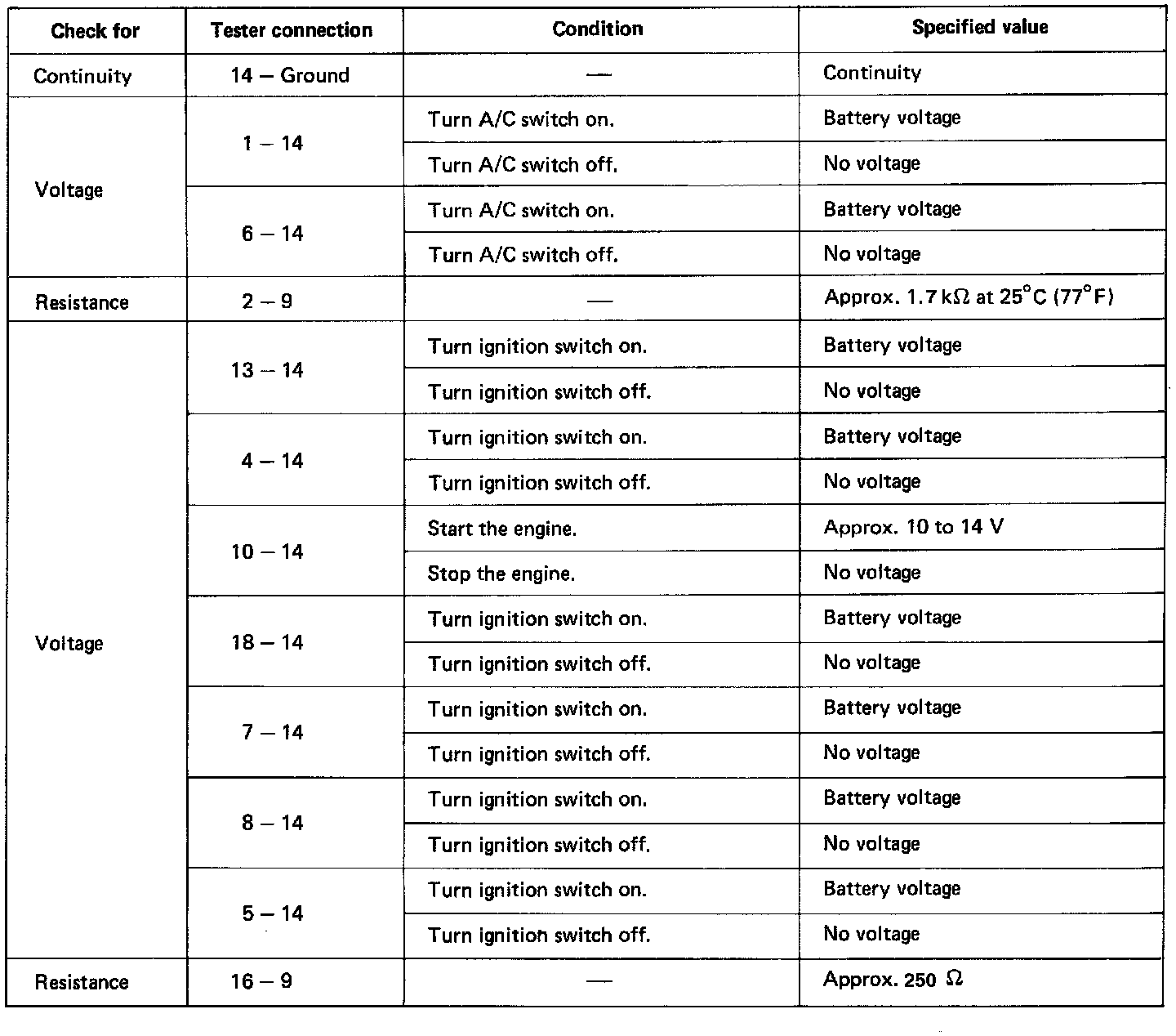 Disconnect the amplifier and inspect the connector on the wire harness side as shown in the chart below.