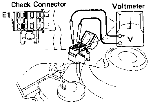 - Connect the positive (+) probe of a voltmeter to terminal VF of the check connector, and negative (-) probe to terminal E1.