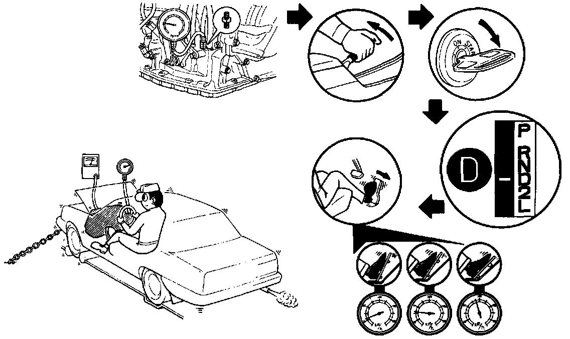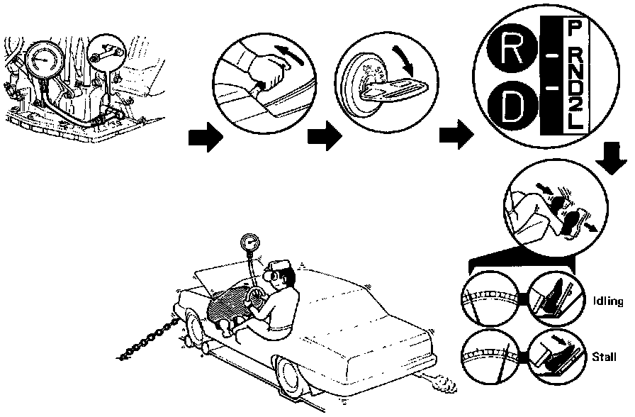 c. Shift into D range, step down strongly on the brake pedal with your left foot and while manipulating the accelerator pedal with the right foot, measure the line pressure at the engine speeds specified in table.
