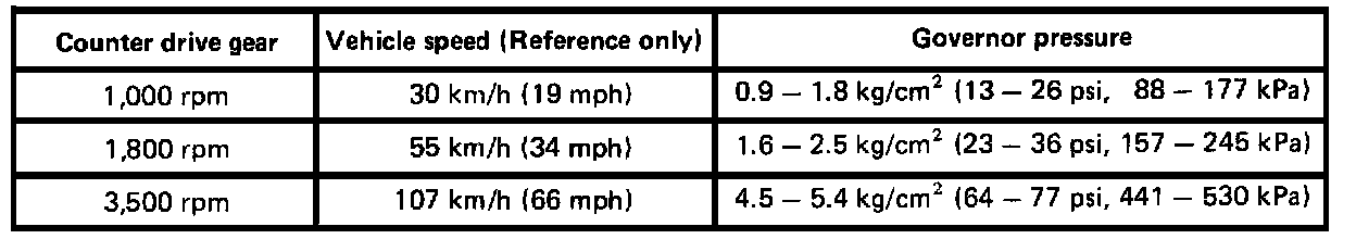 c. Shift into D range and measure the governor pressures at the speeds specified in the table.