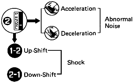 Shift into the 2 range and while driving with the accelerator pedal held constant at specified point (throttle valve opening 50% and 100%) and push in one of pattern selectors, check on the following points.