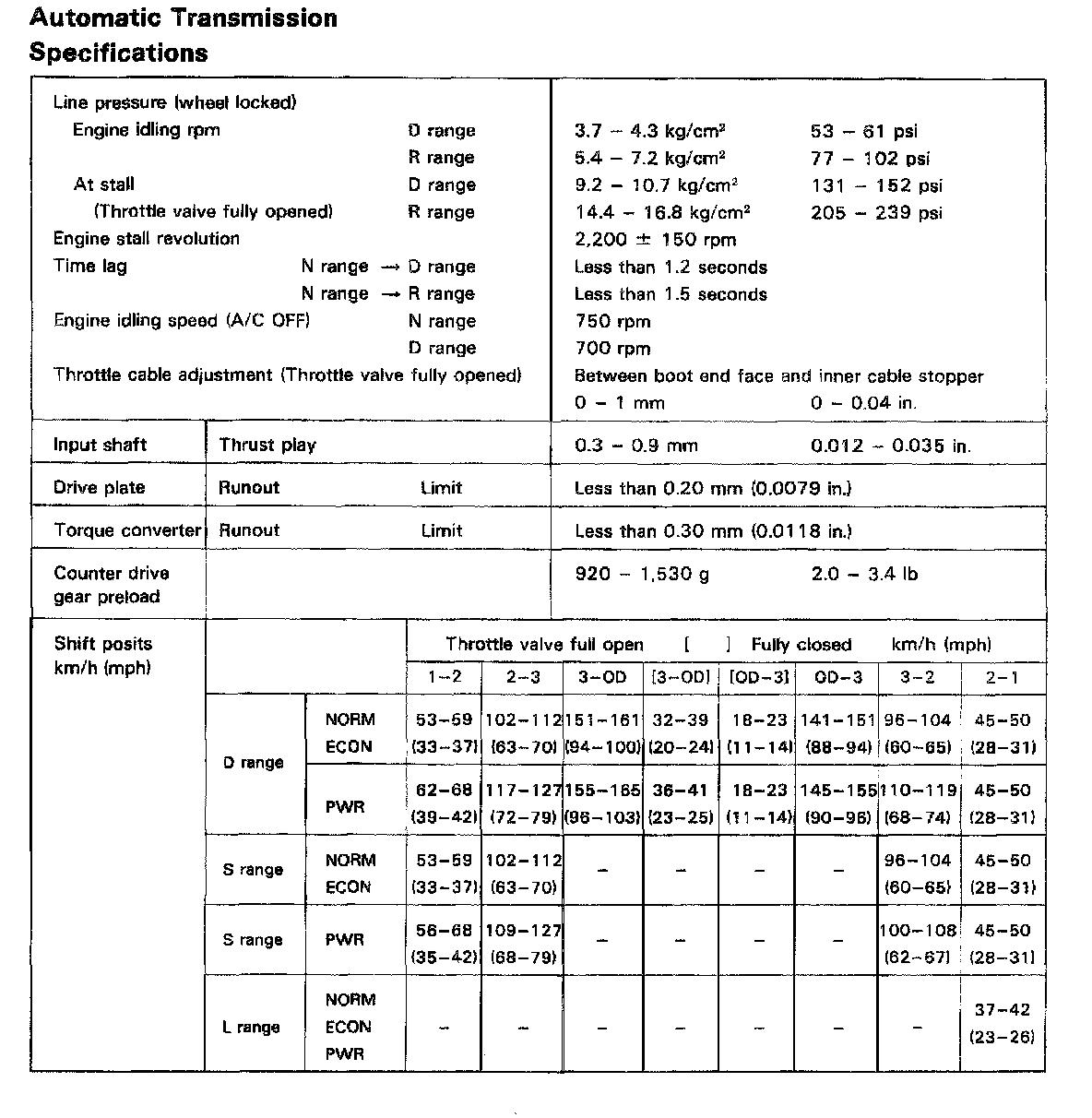 A140E 3-spd O/D A/T, Line Pressure/Shift Points (3S-GE Engine):
