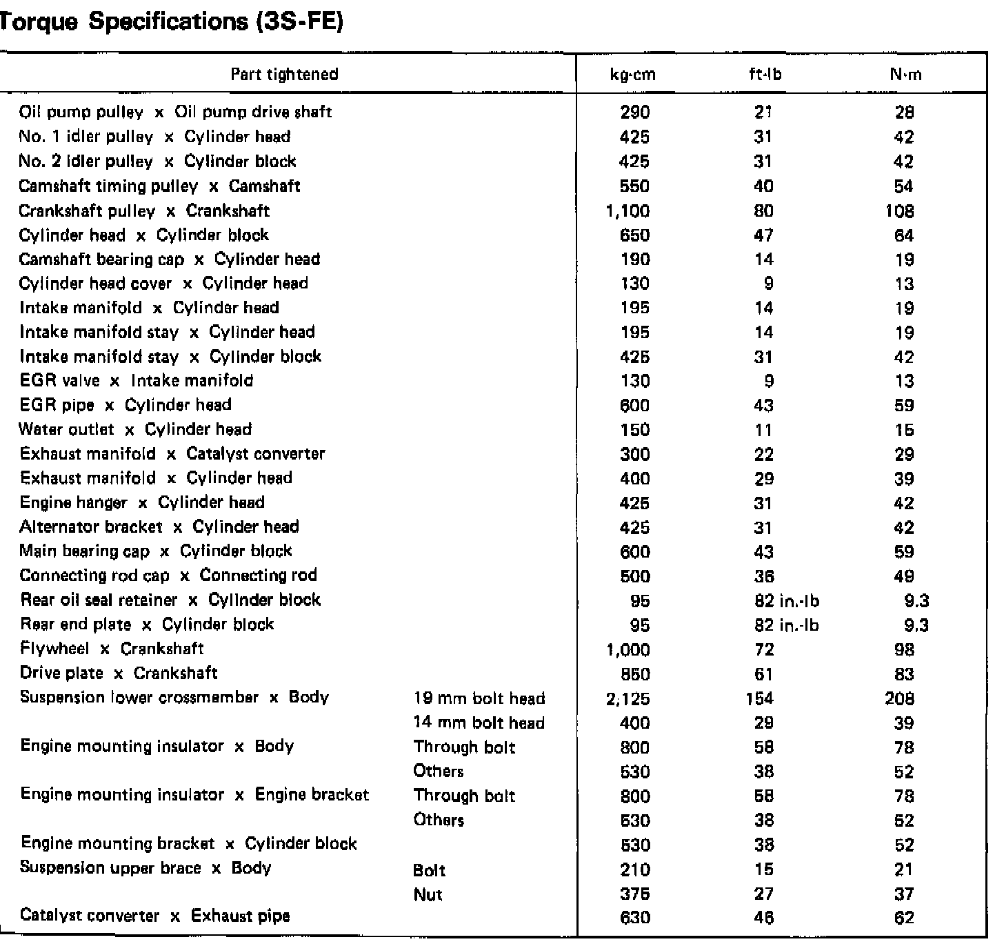 Lower Engine Torque Values 3S-GE/3S-FE: