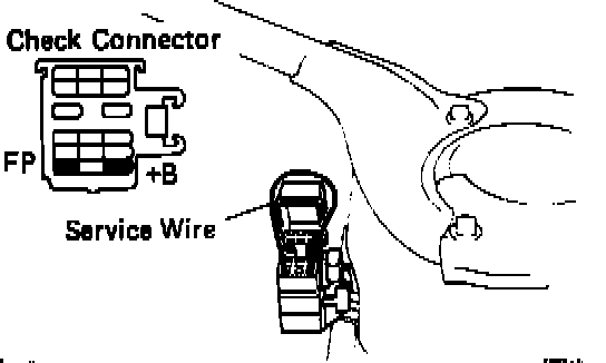 1. Turn on ignition but do not start engine. Then connect terminals of fuel pump check connector with jumper wire as shown in image above. Connector is located near the left front shock tower.