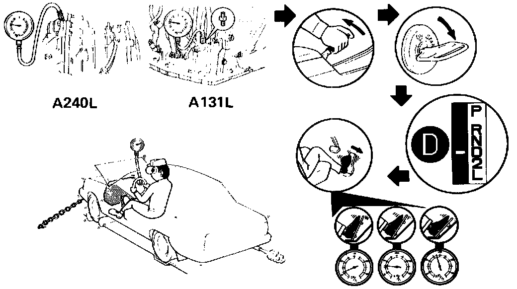c. Shift into D range, step down strongly on the brake pedal with your left foot and while manipulating the accelerator pedal with the right foot, measure the line pressure at the engine speeds specified in table.