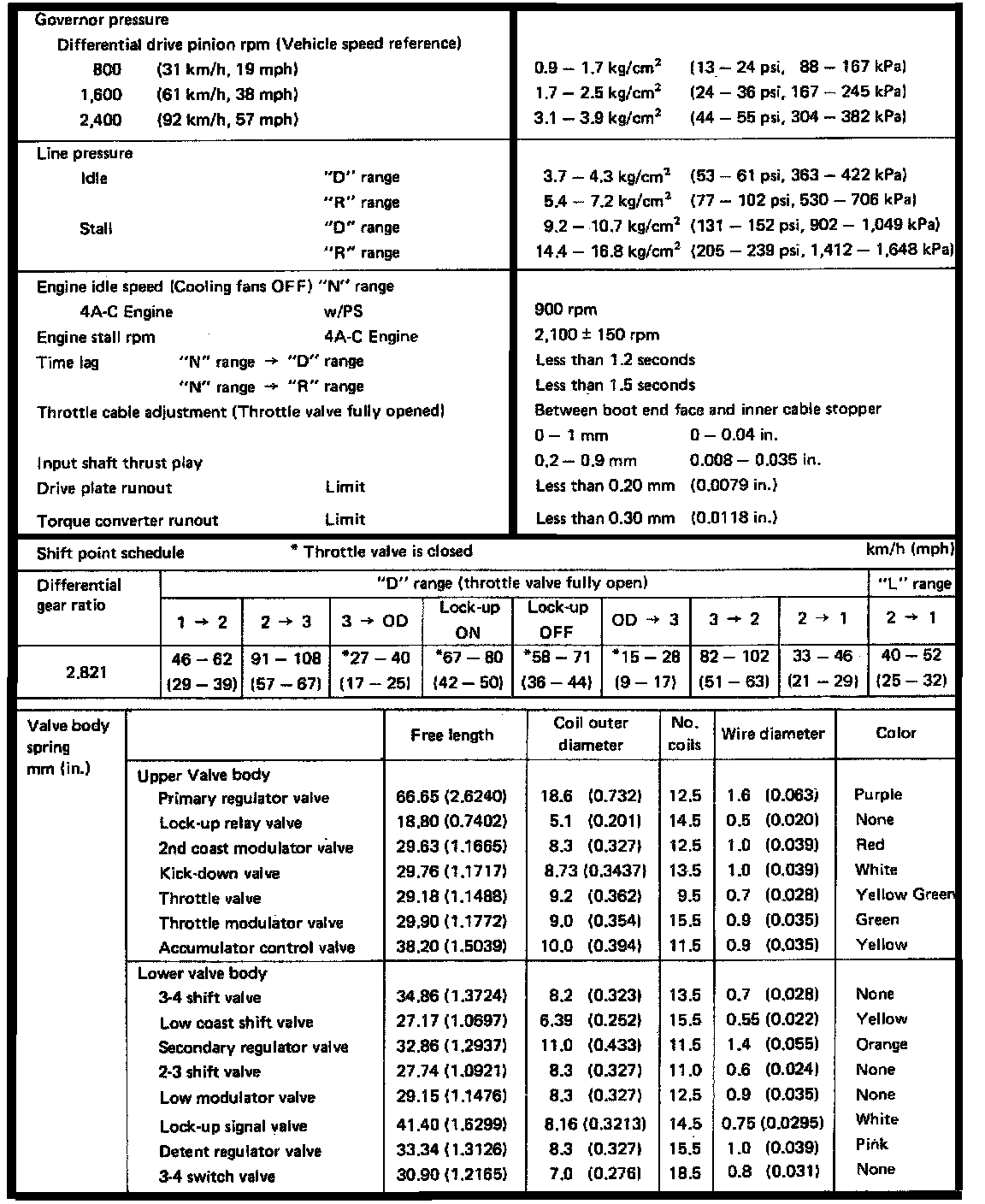 A240L 3-spd O/D A/T, Line Pressure/Ratios/Spring Clearance: