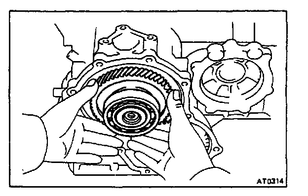 c. Hold the input shaft, and lightly press the oil pump body to slide the oil seal rings on the stator shaft through the direct clutch drum.