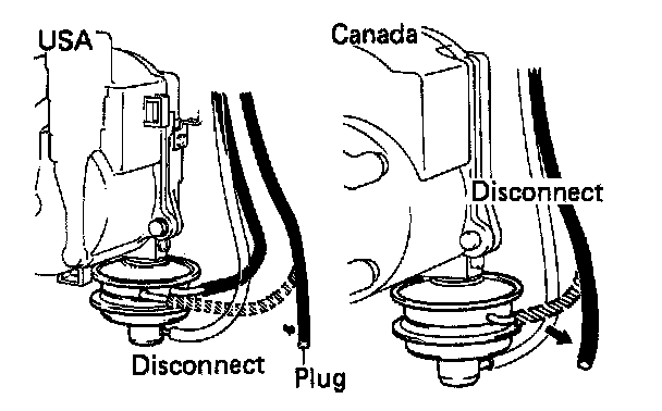 1. Connect timing light to engine.2. Disconnect and plug the hose from the vacuum advancer sub-diaphragm as shown.