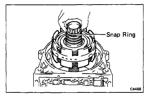 With the case in upright position, make sure that the clutch pack is lower than the ledge below the snap ring groove.