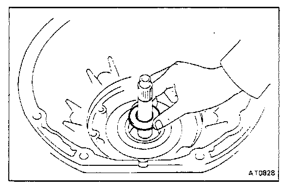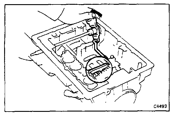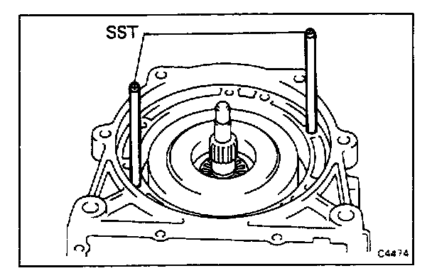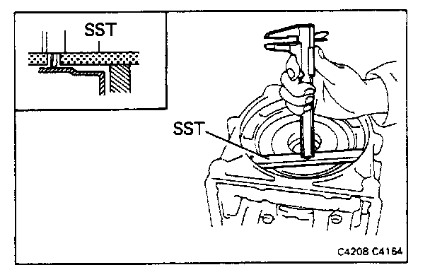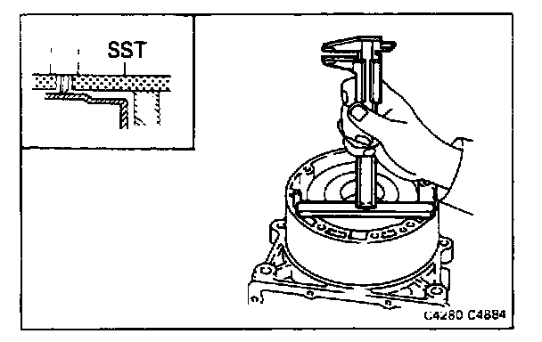 Set SST on the overdrive case as shown in the figure. Measure the distance between the top surface of SST and overdrive clutch. If the distance corresponds to that during disassembly, the overdrive clutch is installed correctly.