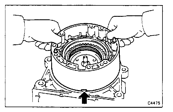 Insert the overdrive case gently through the two guide pins with the circled part in the figure facing in the direction indicated.