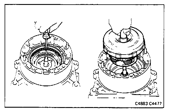 If the rear clutch is fully meshed with the center support, the splined center of the clutch will be flush with the end of the sun gear shaft.