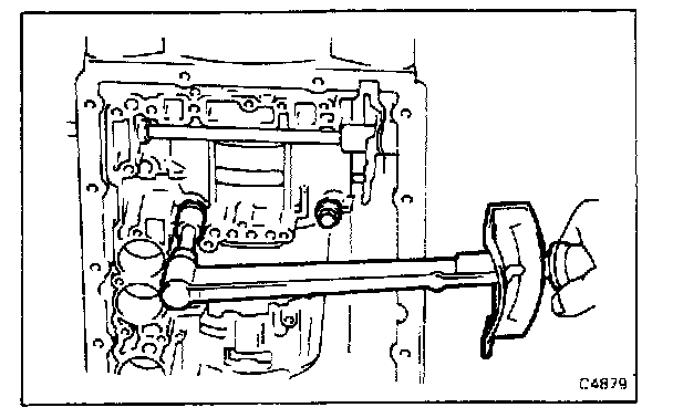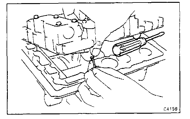 Make sure the accumulator pistons are pressed fully into the bore. Align the manual valve with the pin on the manual valve lever, and lower valve body into place.