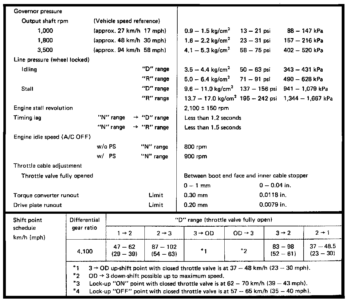 A42DL 3-spd O/D A/T, Line Pressure/Shift Points: