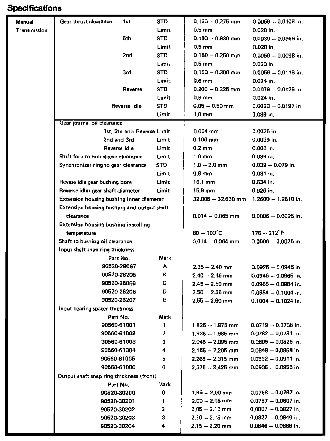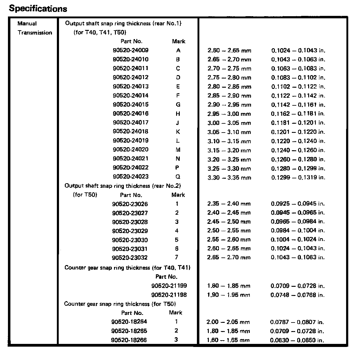 T40/T41 4-spd & T50 5-spd M/T, Output Shaft Clearances:
