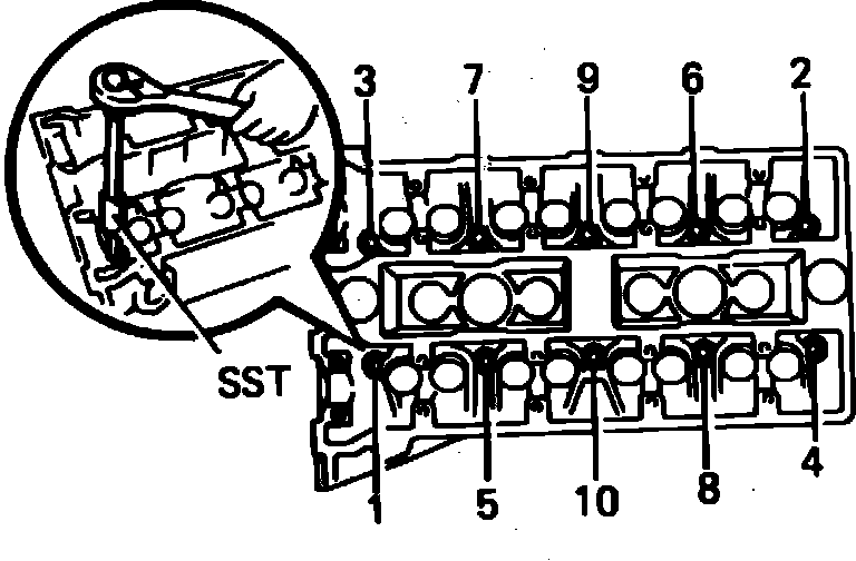 Fig. 34 Cylinder head bolt removal sequence. 4A-GE, 4A-GEC, 4A-GEL & 4A-GELC engines:
