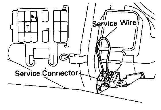 1. Connect timing light to engine.2. Short terminals T and E1 of the service connector, which is located next to the resonator, as shown.