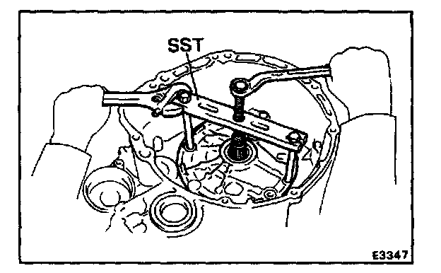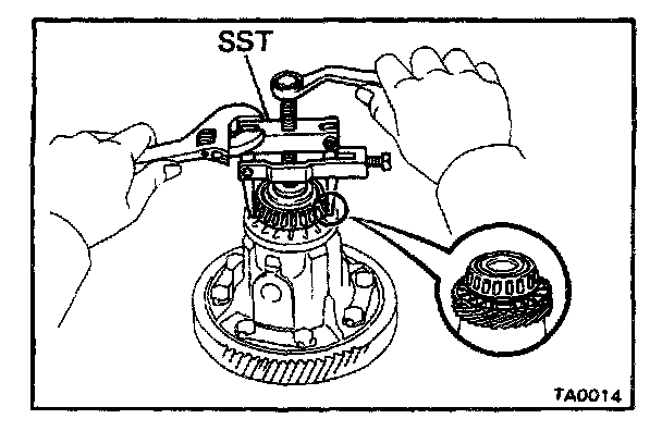 a. Setting SST to the cut-out portion on the speedometer drive gear, remove the bearings from both sides of the case.