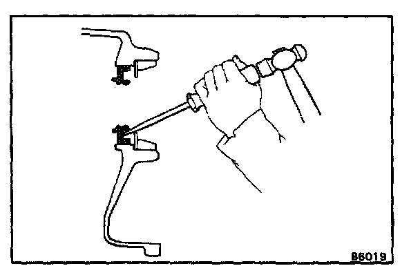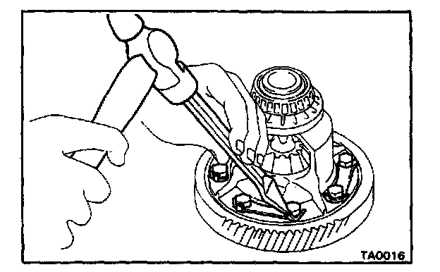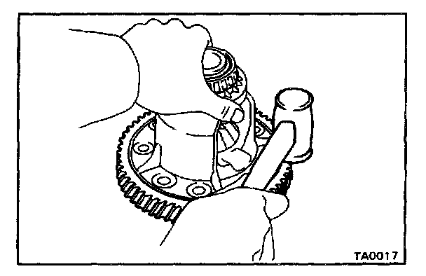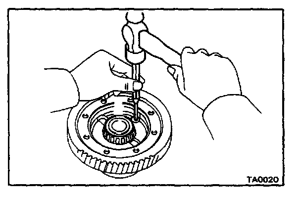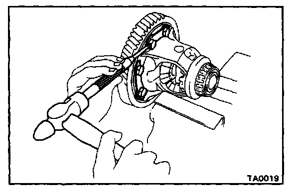 1. Using a hammer and a punch, drive the lock pin through the case and hole in the pinion shaft.