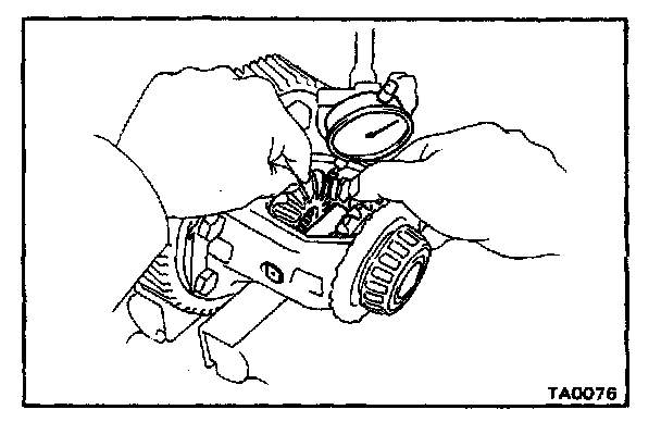 Measure the side gear backlash while holding one pinion gear toward the case.