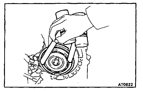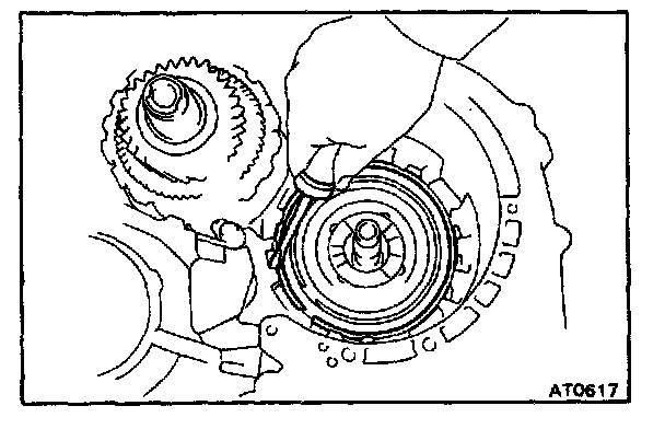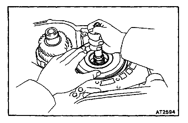 d. Hold the input shaft, and lightly press the oil pump body to slide the oil seal rings on the stator shaft through the direct clutch drum.