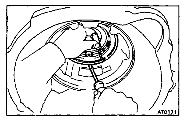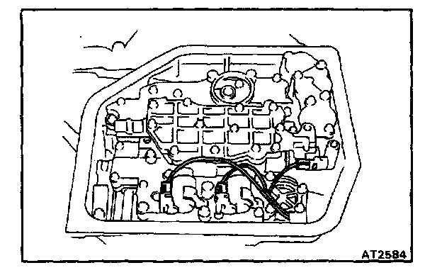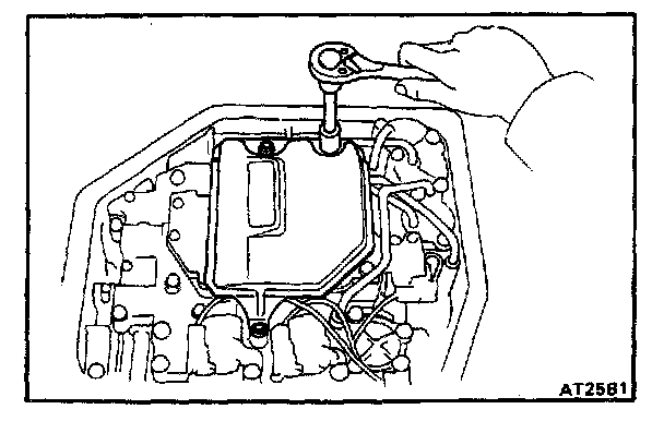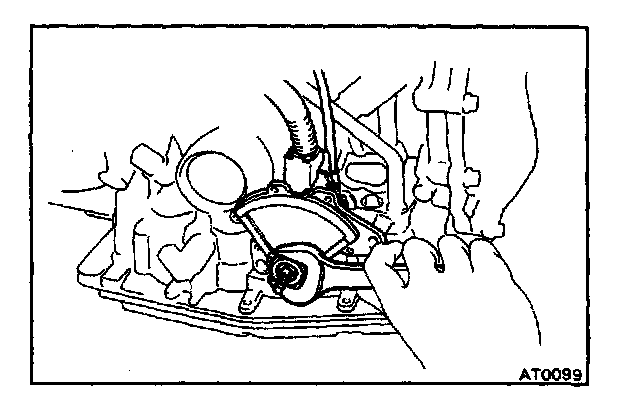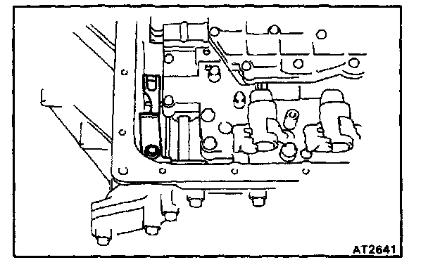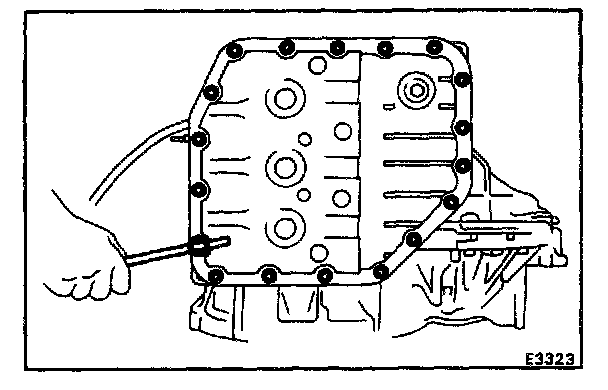 CAUTION: Do not turn the transmission over as it will contaminate the valve body with the foreign materials in the bottom of the pan.