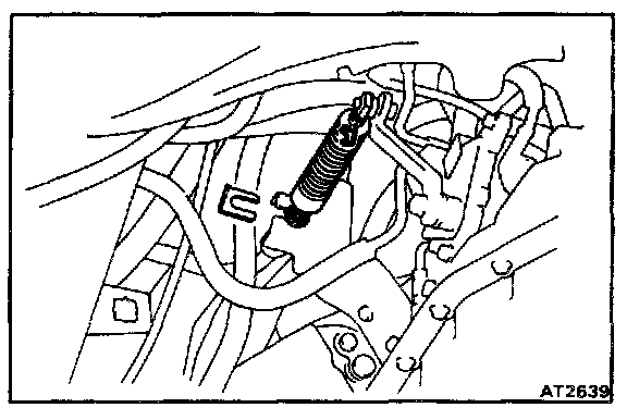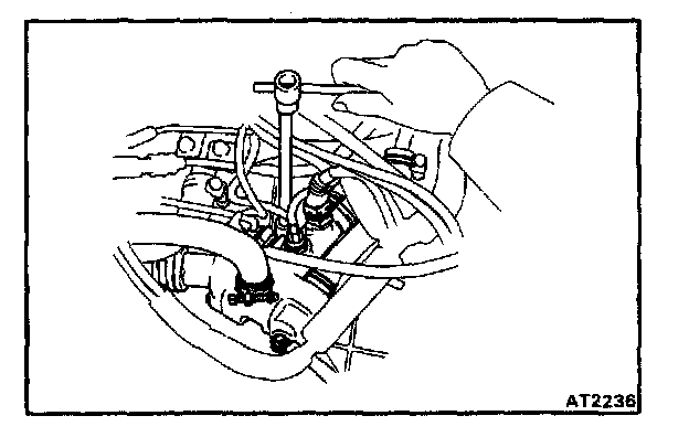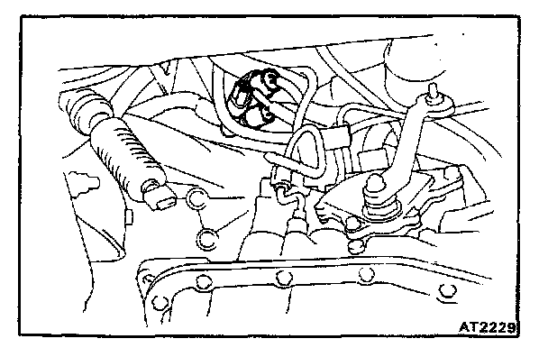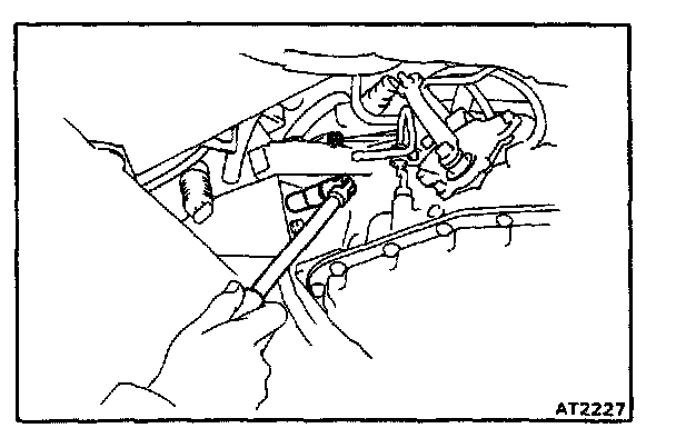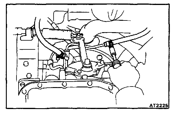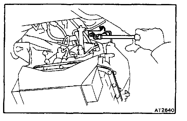 Making sure that neither the throttle cable nor wire harnesses snag inside the engine compartment moving the transaxle back and forth, left and right, remove the transaxle from the engine.