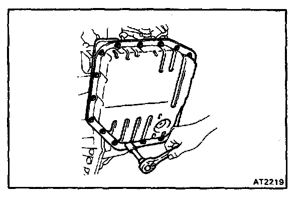 CAUTION: Some fluid will remain in the oil pan. Remove all pan bolts, and carefully remove the pan assembly. Discard the gasket.