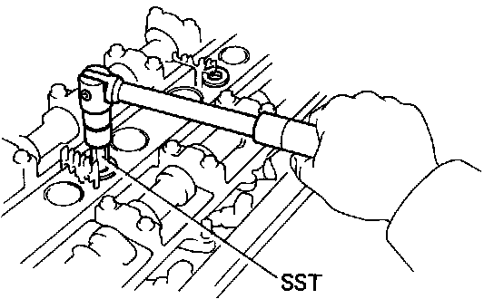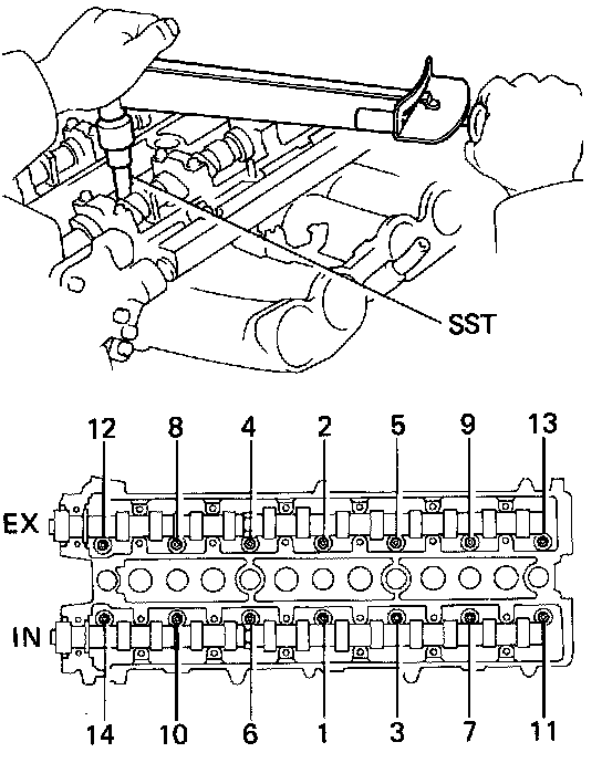 (e) Using SST, install and uniformily tighten the fourteen cylinder head bolts in several passes and in the sequence shown. SST 09043-38100