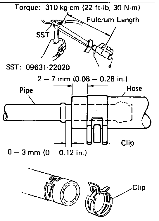 ^ Push in the pipe and insert-type hose to the specified position, and install the clip to the specified location. If reusing the hose, reinstall the clip at the original location.