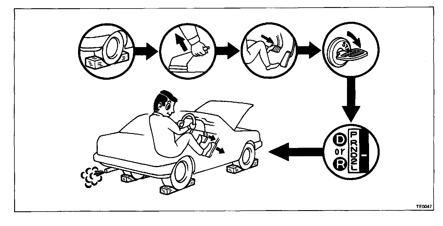 d. The stall test should always be carried out in pairs. One should observe the conditions of wheels or wheel stoppers outside the vehicle while the other is performing the test.