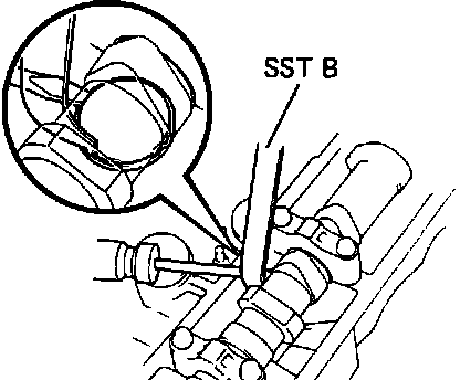 - Using SST (A), press down the valve lifter and place SST (B) between the camshaft and valve lifter. Remove SST (A).