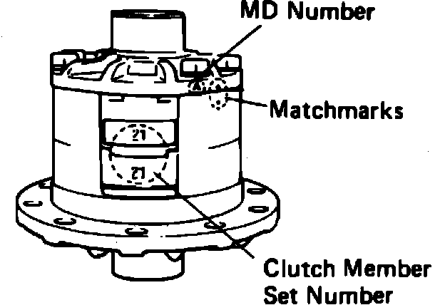 1. Scribe alignment marks between differential case and cover, and record ``MD'' number and left and right clutch member markings, Fig. 37.