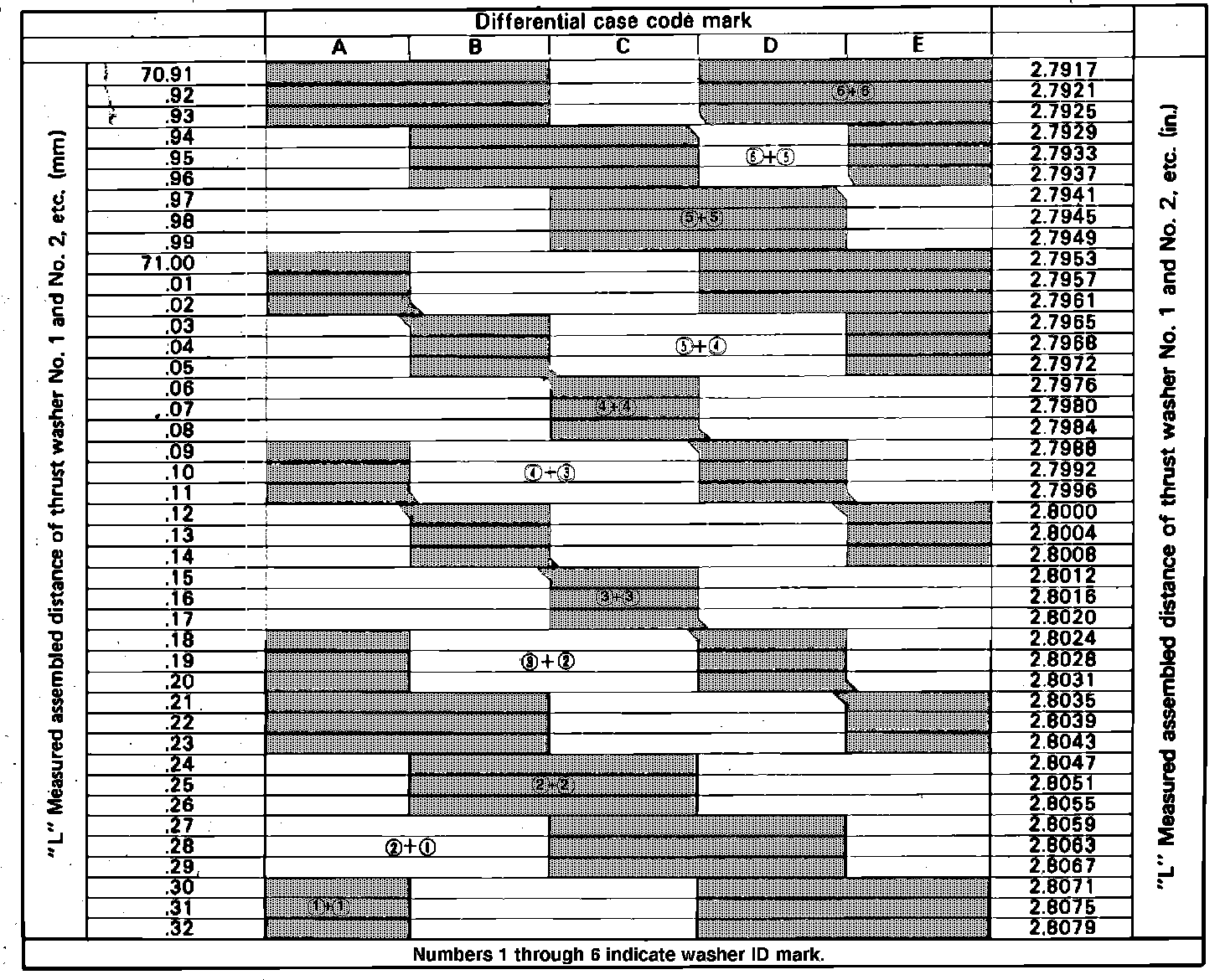 7. Match differential case dimension (MD code) recorded in step 1 with dimension ``L'' recorded in step 6, then select adjusting washers from charts, Fig. 42.
