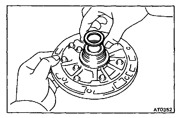 d. Hold the input shaft, and lightly press the oil pump body to slide the oil seal rings on the stator shaft through the direct clutch drum.