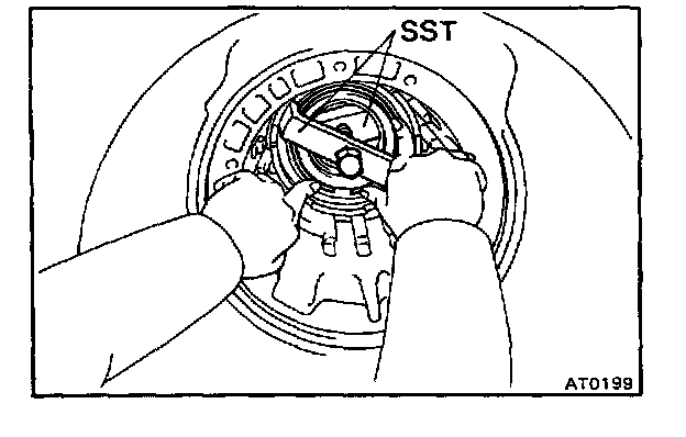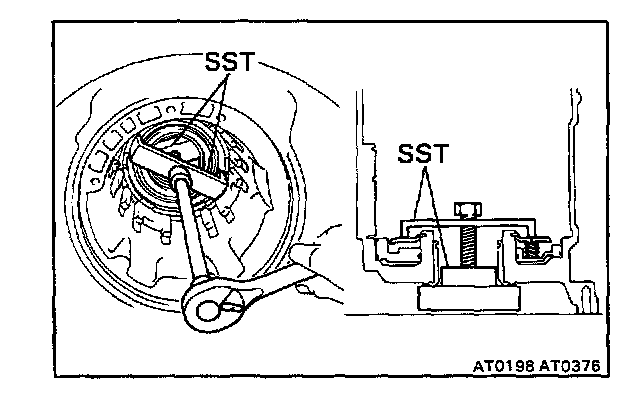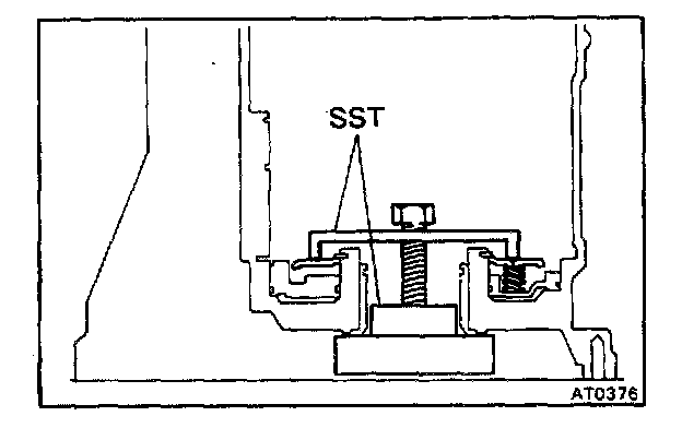 Gradually tighten the bolt to compress the springs, being careful not to damage the transmission case with SST.