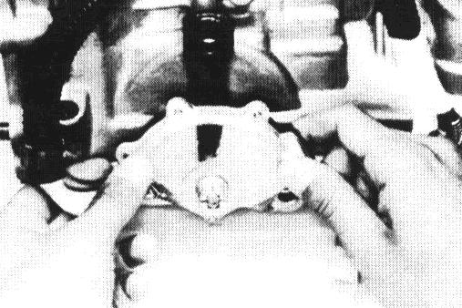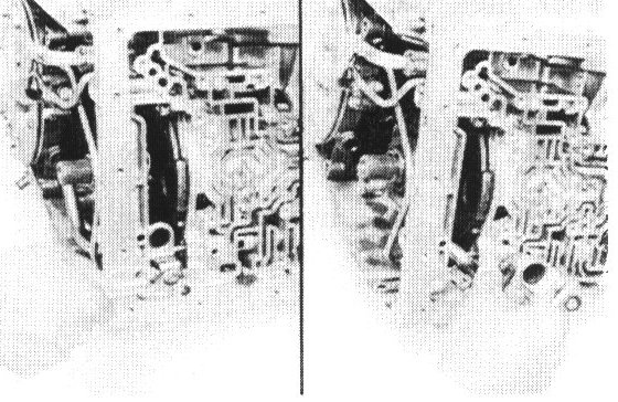 Position a rag to catch each piston. Using low-pressure compressed air (1 kg/sq.cm, 14 psi or 98 kPa max.) pop each piston into the rag. Force air into holes shown, and remove the pistons and springs.