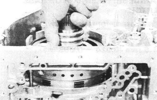 Using a long screwdriver, compress the snap ring and lift it above the groove with a wire hook.