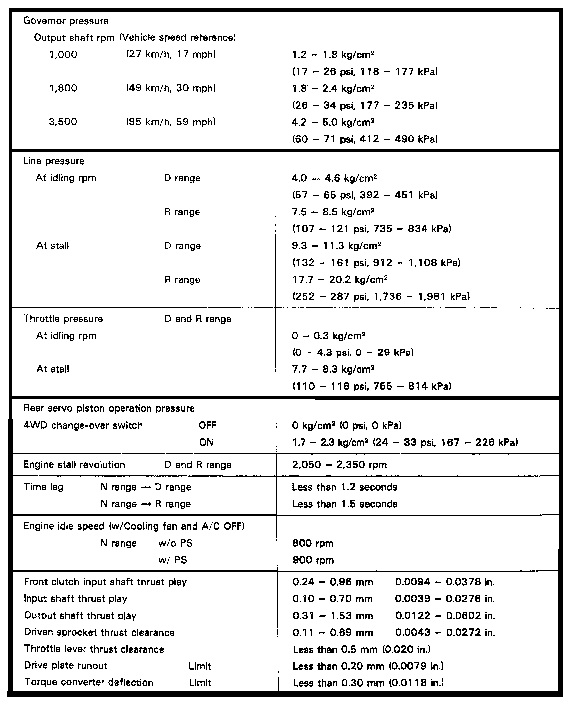 A55F 3-spd A/T, Line Pressure/Clearances: