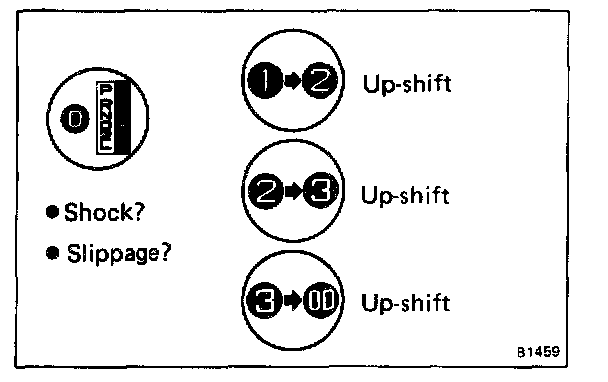 a. At each of the above pedal opening, check to see that 1 -> 2, 2 -> 3 and 3 -> OD up-shift take place and also that the shift points conform to those shown on the automatic shift diaphragm.