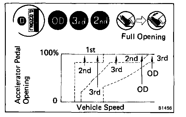 d. While running in the D range 2nd, 3rd gears and OD, check to see that the possible kick-down vehicle speed limits for 2 -> 1, 3 -> 1, 3 -> 2, OD -> 3 and OD -> 2 kick-downs conform to those indicated on the automatic shift diagram.